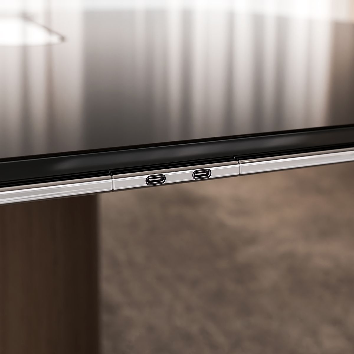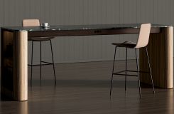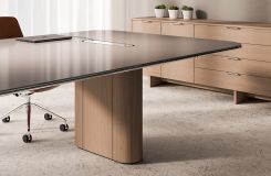The communal table features a refined metal rail with optional power, while the conference tables beautifully integrates technology in the surface or edge, making it convenient for users to access. For an added touch of refinement, conference tables can be specified with an optional anodized aluminum edge that harmonizes beautifully with the surrounding materials.