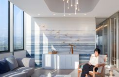 The clean timeless lines of this Crew glass-surfaced Crew credenza is the perfect accompaniment to this stylish space.