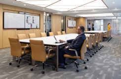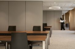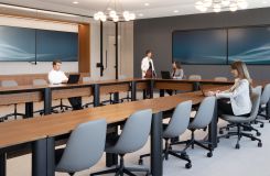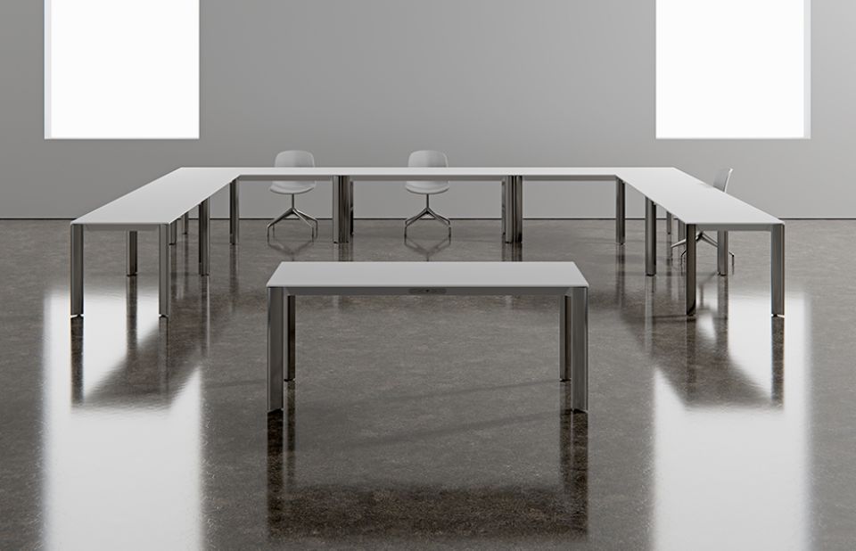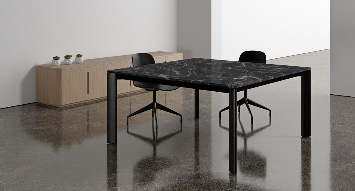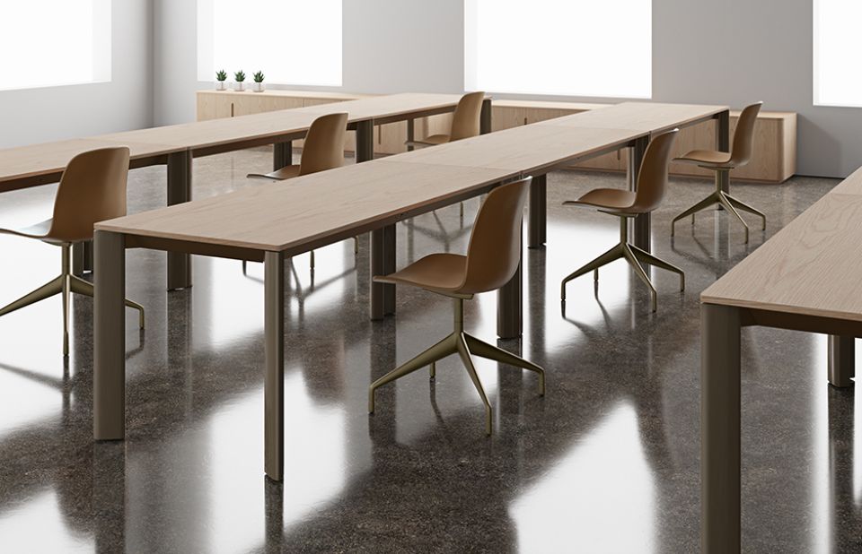 Crew reconfigurable tables with FENIX NTM Grigio Efesso surfaces and light bronze bases are the perfect choice for this refined and flexible space. Halo credenzas with matching bronze bases and back-painted glass tops add heightened sense of elegance.