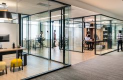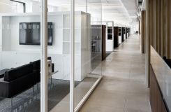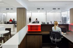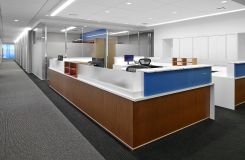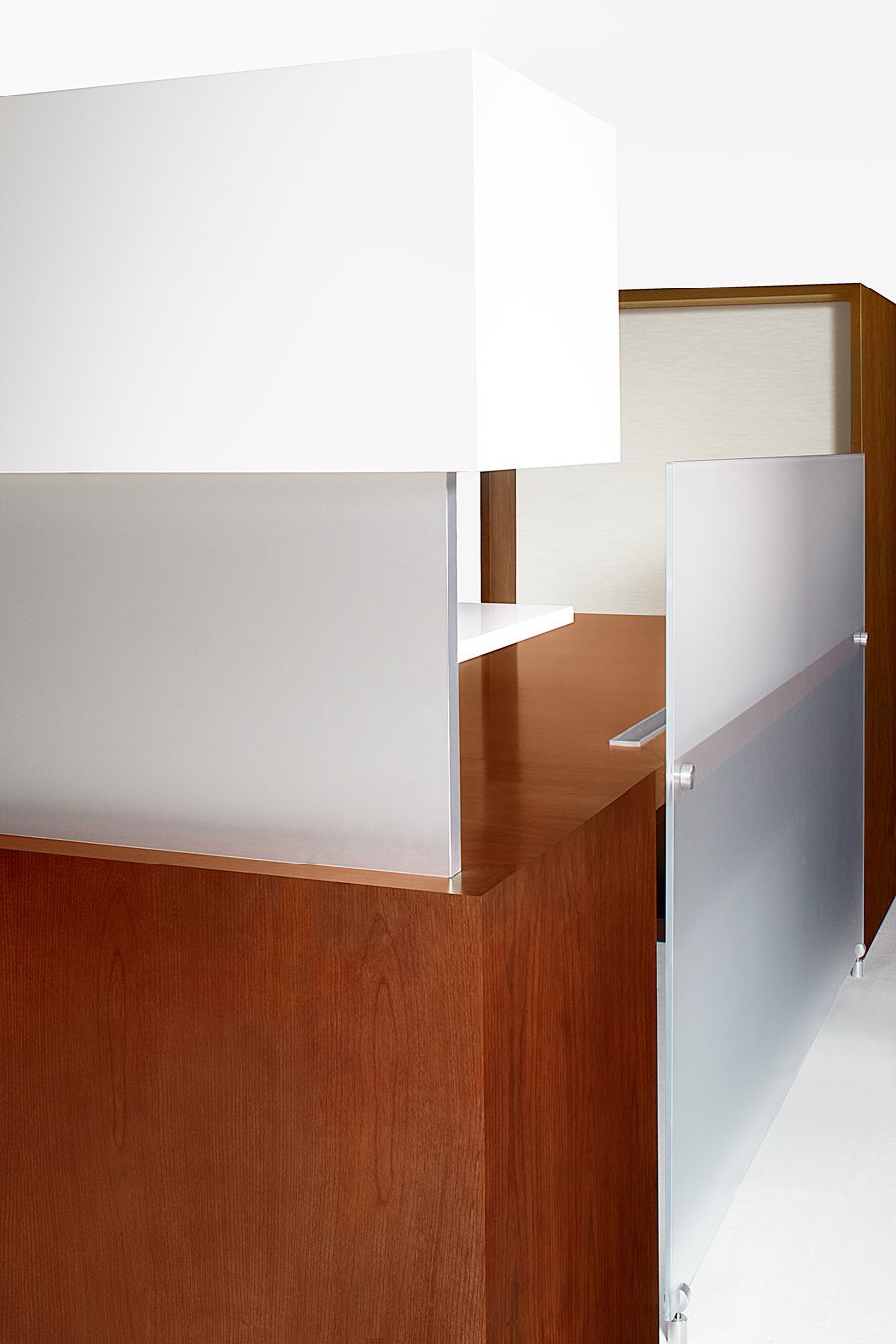 Custom-designed workstations incorporate anigre veneers with white casework, aluminum-framed Forbo screens, and floating glass transaction counters.
