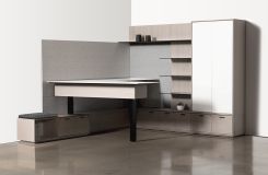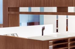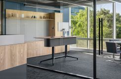 This workstation features a full range of materials with walnut veneers, laminate, chrome, fabric, etched glass, and stone.