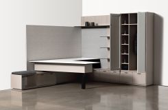 Substantial storage options are cleanly integrated into custom double-door glass front wardrobe.