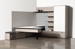 Stone, tinted glass, acrylic, veneer, laminate, and aluminum beautifully integrate into a unique solution.