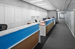 This open benching is fabricated with laminate casework, blue-tinted glass screens, and a specialized, high-density power/data system.
