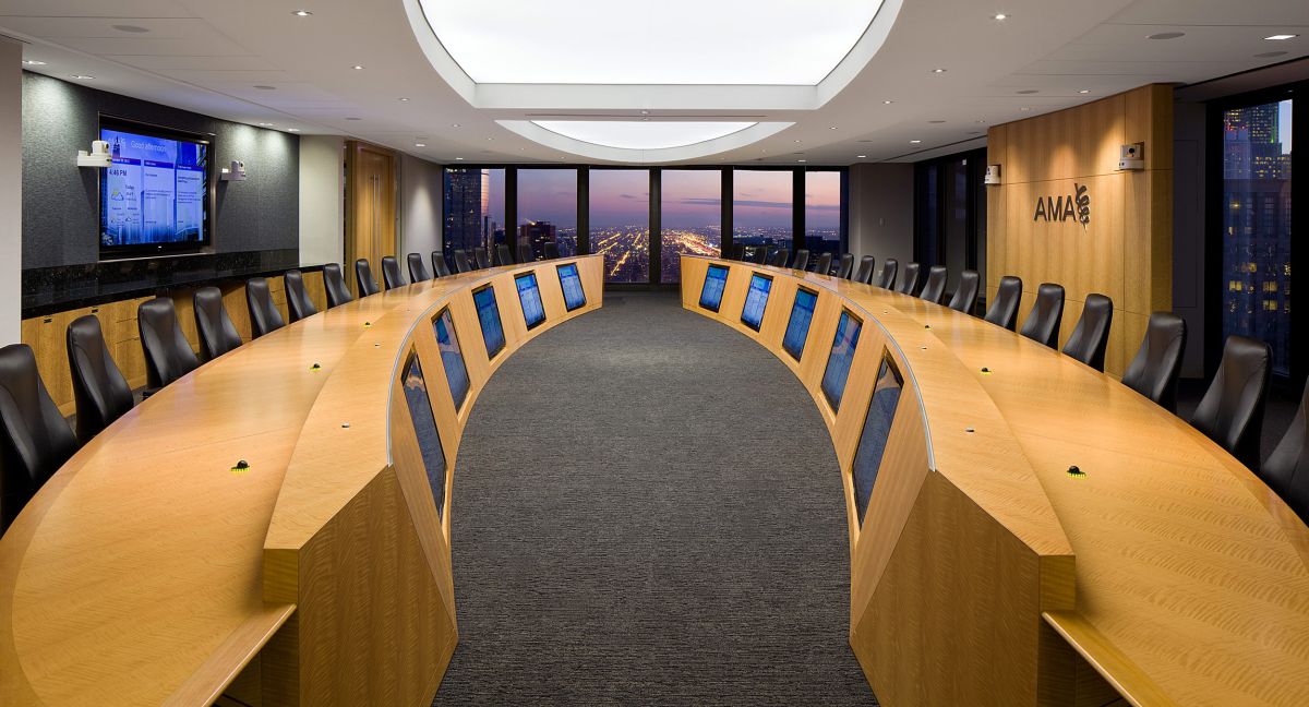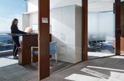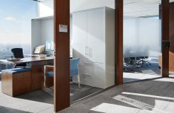 Custom cabinet partitions offer integrated A/V technology and general office storage.