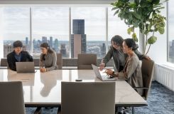A complete HALCON custom solution including custom Helm adjustable-height desk, work wall, meeting table, and reception station.