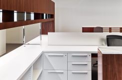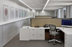 Open plan workstations feature white laminate and casework resulting in a beautiful, clean, and modern aesthetic.