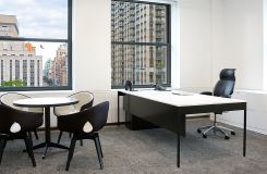 IMG's private offices feature custom desks with white Corian or glass paired with bronze table legs.