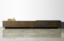 HALO credenzas in natural flat cut walnut with deep bronze pulls and base.