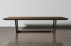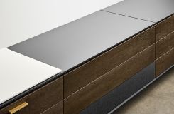 66 x 66 Soft Square Halo table with 2cm stone surface and Halo credenza in August Hickory and Deep Bronze.