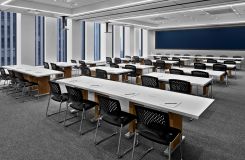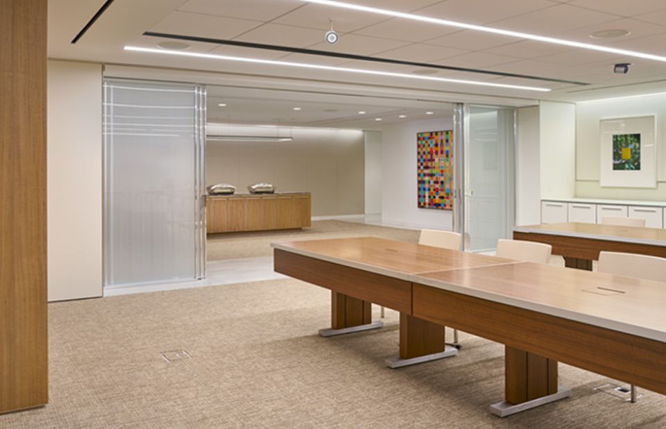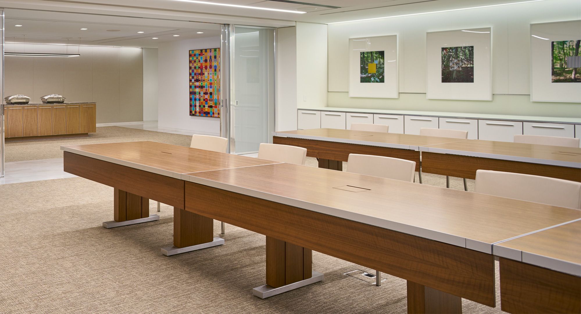 Motus tables in book-matched White Oak bring an executive level finish to this reconfigurable space.