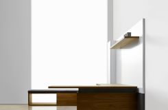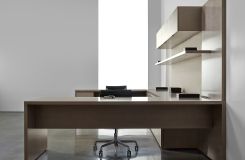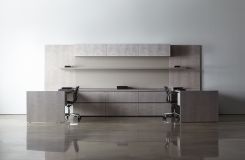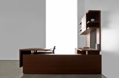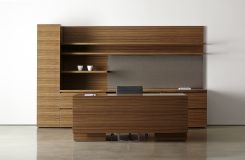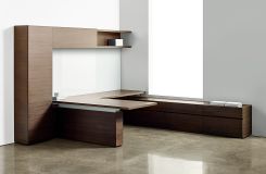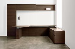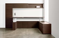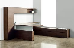 New Millennia private office in figured walnut with an adjustable-height work surface. A matching credenza and Sessions meeting table with polished chrome base complete this elegant space.