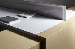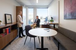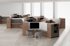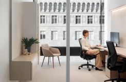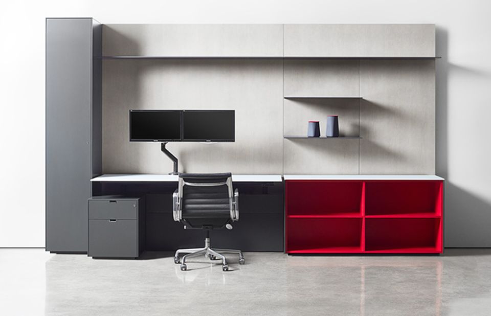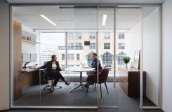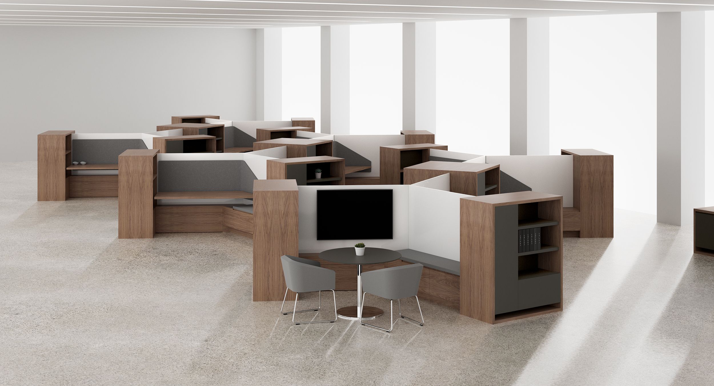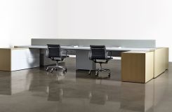 An adjustable-height New Millennia private office is perfectly complemented by a glass surfaced Sessions table and Halo bench.