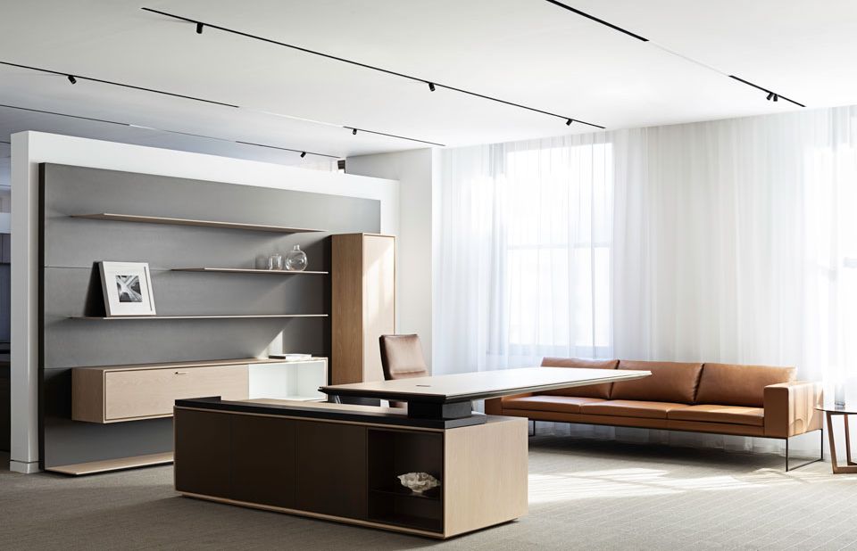 Stunning HALO OFFICE Executive work wall in custom white Oak is the perfect complement to the timeless design of the HELM adjustable-height desk.